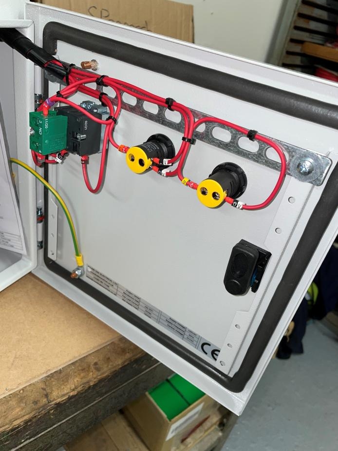 Our electrical control boxes have a locking Isolator, 24v low power transformer, safety checking relay and a timer all built in so we can control solenoid locking switches on some of our projects. They also have indicator lights and an estop.