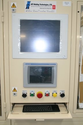 This guarding cell surrounds a welding machine. The cell consists of perimeter safety fencing, polycarbonate viewing windows, electrical enclosures (photo below) and hinge + slide pull-out keyboard stations. Expertly powder coat finished white.